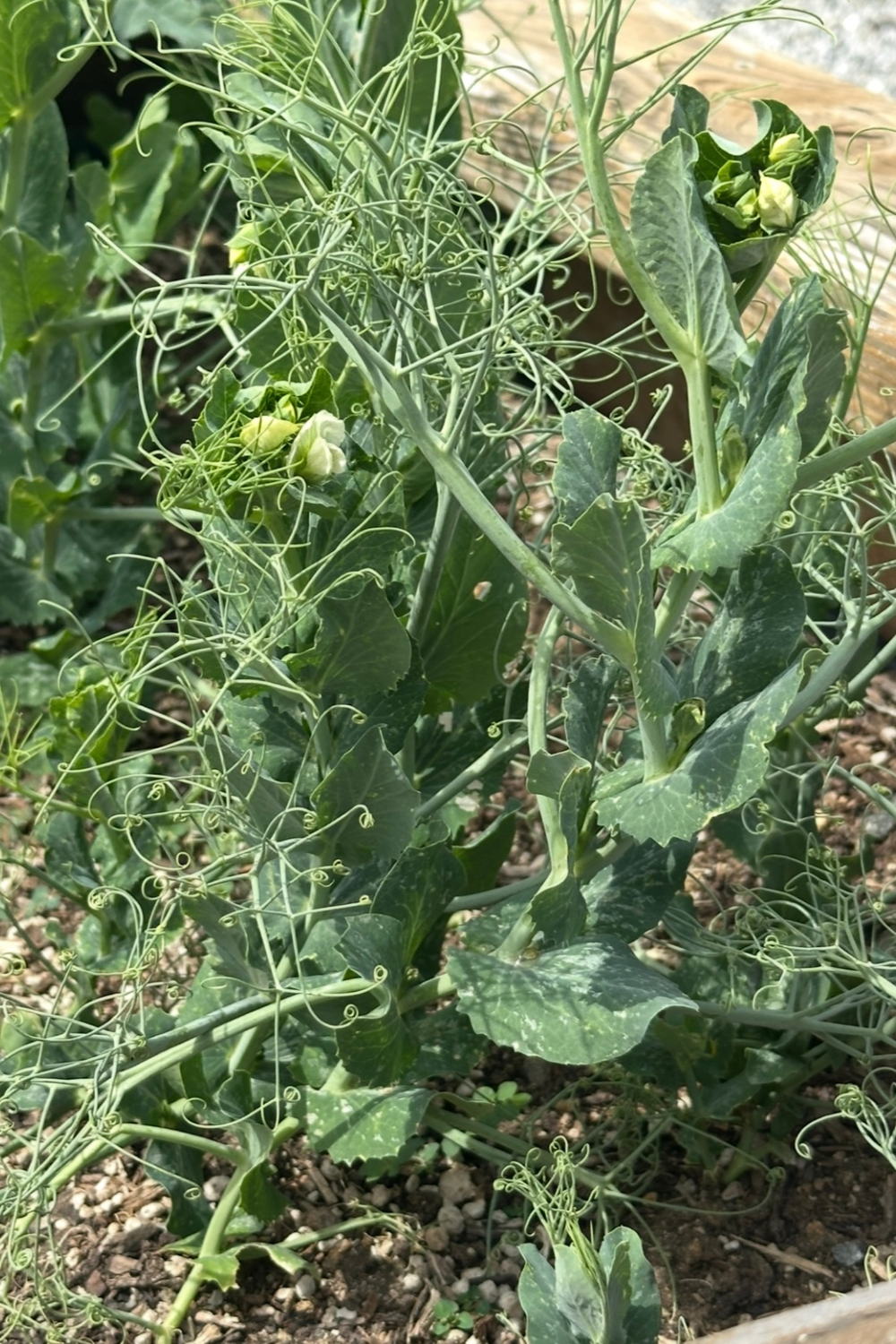 Early spring plantings are starting to grow, with climbing peas, soft herbs, strawberries, kale, and flowers like scarlet flax beginning to fill the garden.
